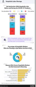 In other words, a record 892,000 accommodation and food-services workers quit their jobs. But it’s not just the hospitality industry taking a hit. Phillip Kane in his Inc. Magazine piece, The Great Resignation is Here, and It’s Real, found that a survey of over 30,000 workers conducted by Microsoft found that 41% are considering quitting. That number jumps to 54% when Gen Z is considered alone. According to Gallup, 48% of employees are actively searching for new opportunities. Additionally, Persio reported that 38% of those they surveyed planned to make a change or resign in the next six months According to Joblist, “While hospitality workers who reported being very satisfied prior to the pandemic are more likely to still be employed in the industry, they are frequently less satisfied with their jobs than they used to be.”