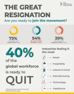 • The pandemic made it feel like the sky was falling-Quitting a job that was laying off or furloughing people seemed safer at the time. Instead of waiting for the dust to settle, job seekers jumped at anything new or different.
