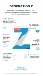 It’s easy to see that this group of job candidates have different characteristics from previous generations. They also offer different talents, skills and knowledge to the hospitality workforce. The oldest of the Gen Z group is 25 years of age. The average age of an employed Hospitality Representative is 46 years old. Therefore, attracting and onboarding Gen Z candidates is a great way to indoctrinate prime candidates and reduce turnover.